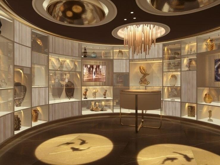 Nestled within the Grand Lobby Boutiques, you can find unique spaces like the Cabinet of Curiosities and Experience Lounge. The Cabinet of Curiosities is a one-of-a-kind rotunda gallery showcasing a 360 degree display of collectables, jewelery, fashion, and art from our partner brands alongside never before seen items from the Cunard archives. Continuously open for exploration, this eclectic collection of curated products, artifacts, and treasures is presented alongside audio and visual media to celebrate the style and intrigue of travel.